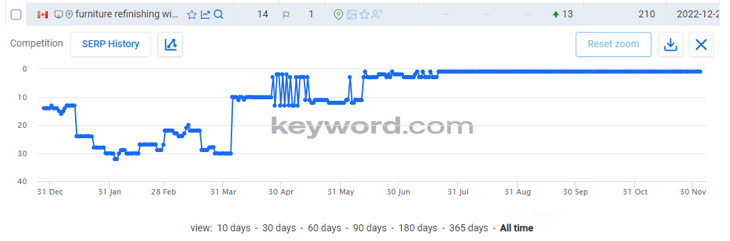 It is now maintaining overall higher rankings for targeted keywords, including consistent #1 positions over time: