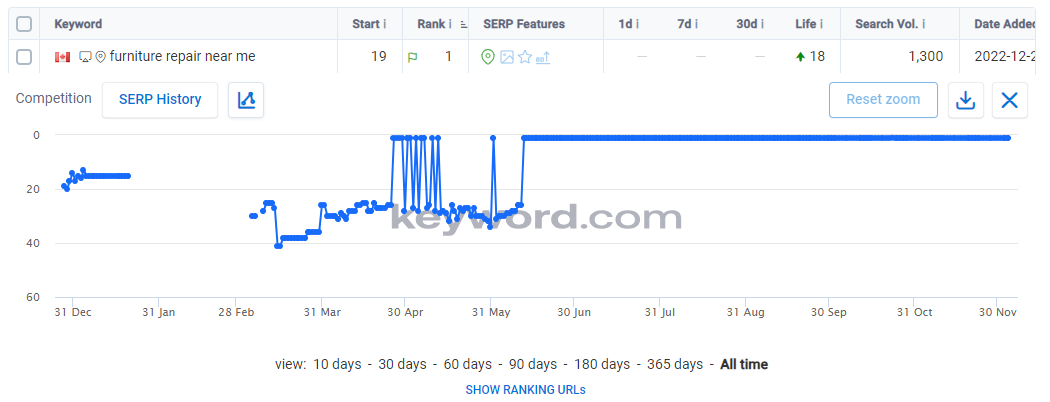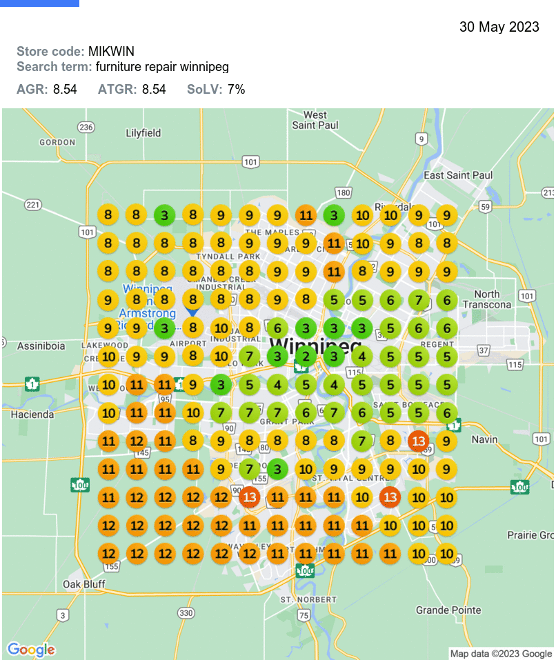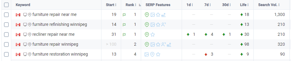 A complete and active GBP profile can contribute to drastic improvements in targeted keyword rankings, such as the ones seen below. Note that the keyword phrase “furniture repair Winnipeg” is up 98 spots!