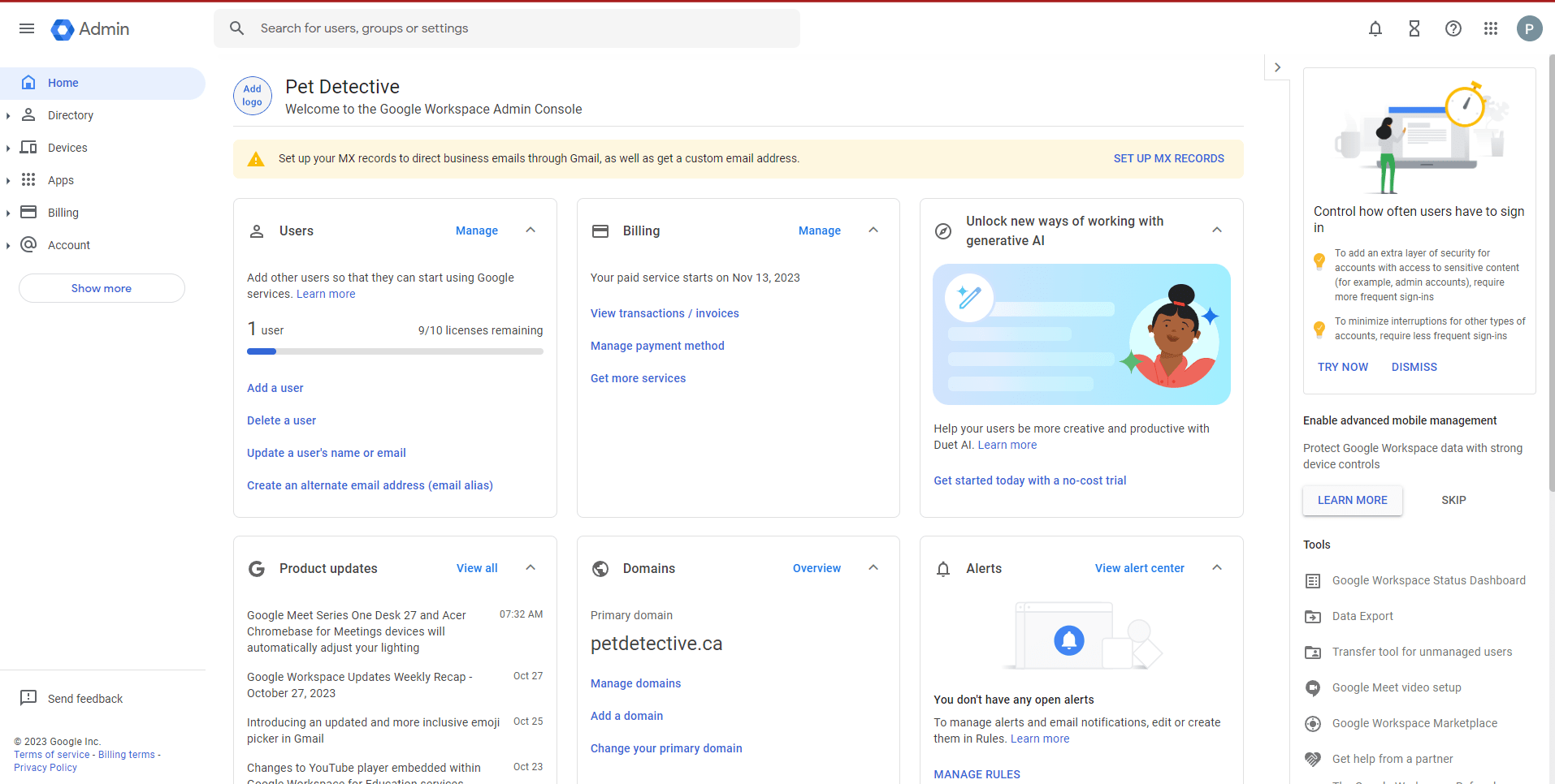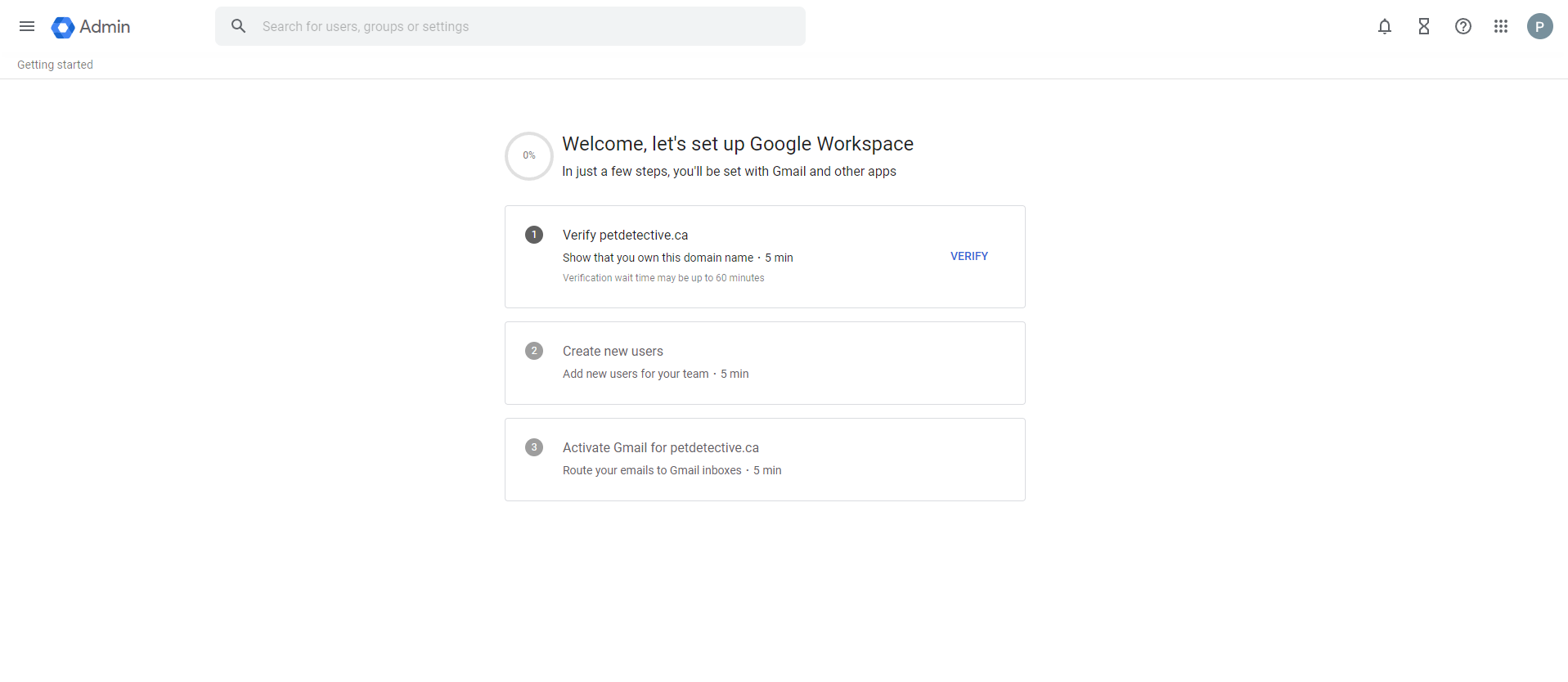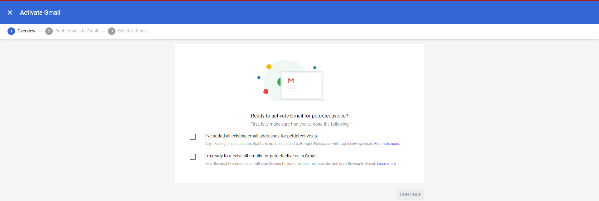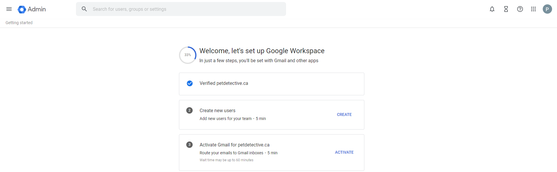 We haven’t added new users for our petdetective.ca domain (it’s just an example page for now), but we can click “Activate” by “Activate Gmail for petdetective.ca” to set up our MX records.