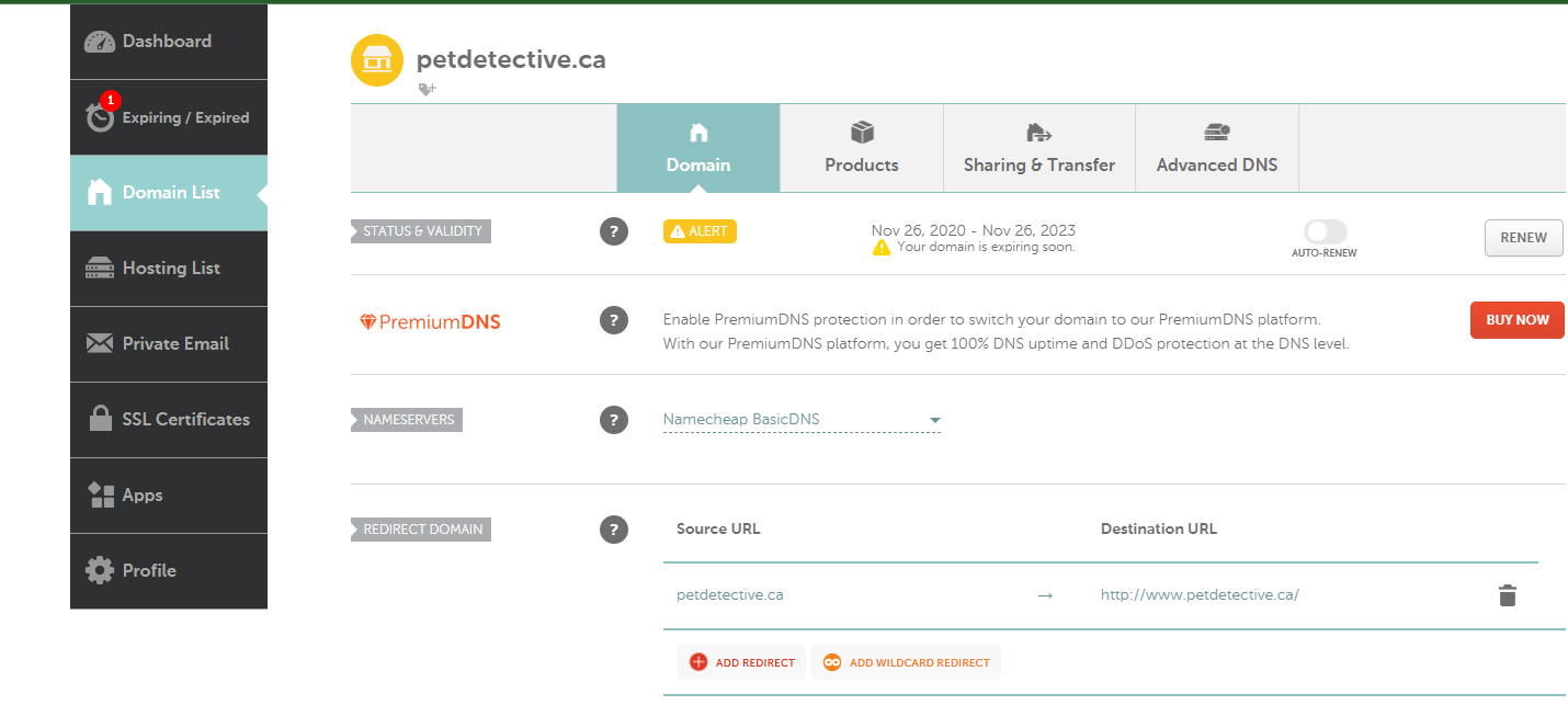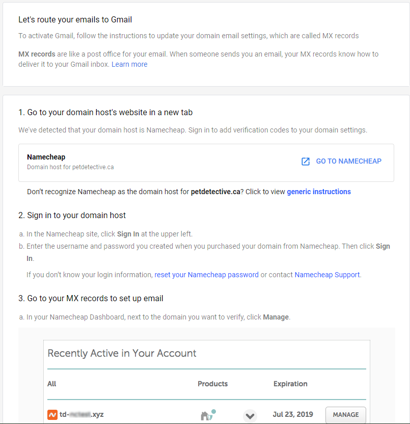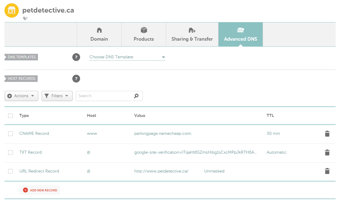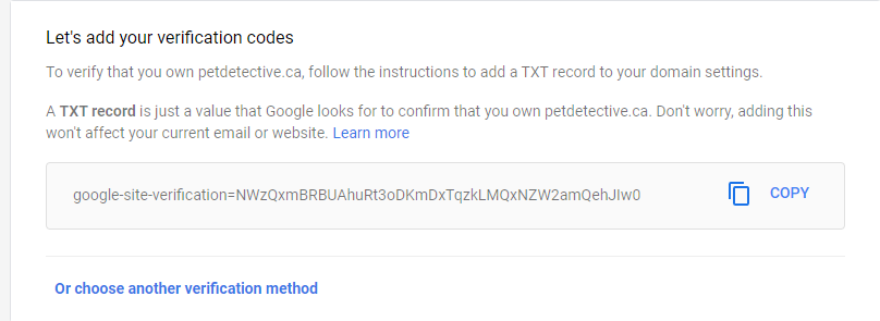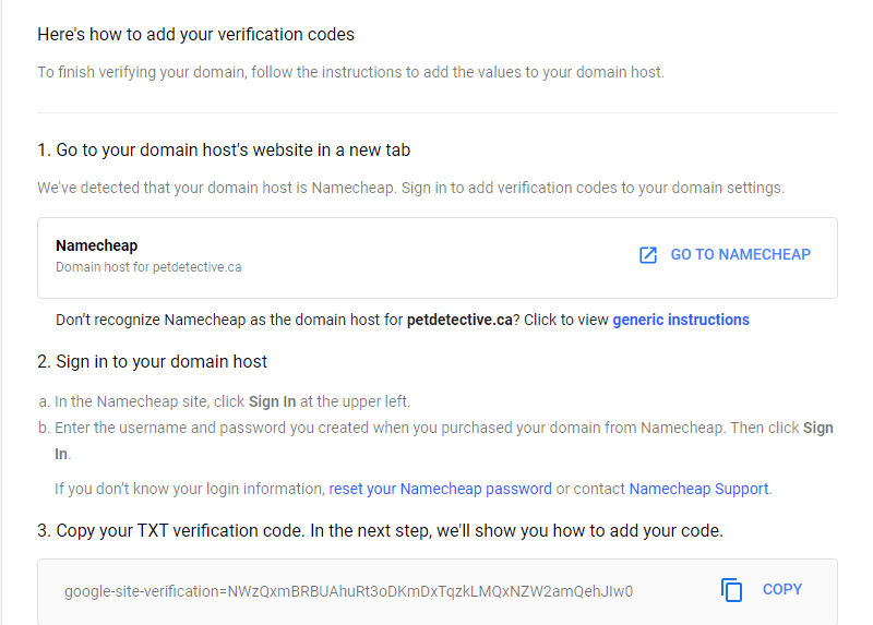 Our site, petdetective.ca, was registered using Namecheap. You may have registered your domain using another domain host—Google will automatically recognize most domain hosts and give you instructions to help you complete TXT verification. For the rest of this guide, we’ll be following the instructions for TXT verification using Namecheap—in most cases, you’ll find the domain host you use follows a similar methodology.
