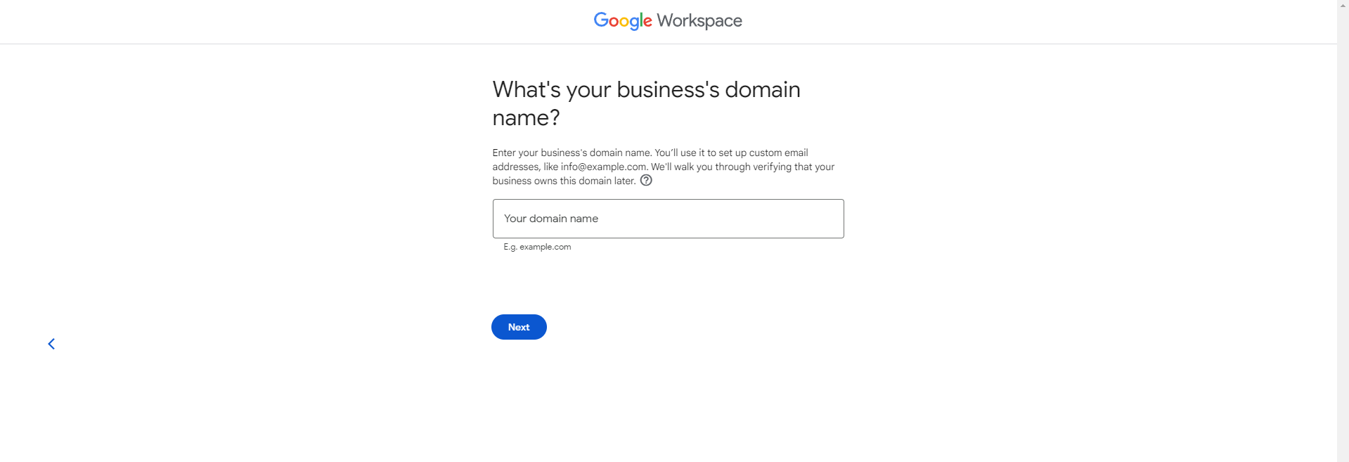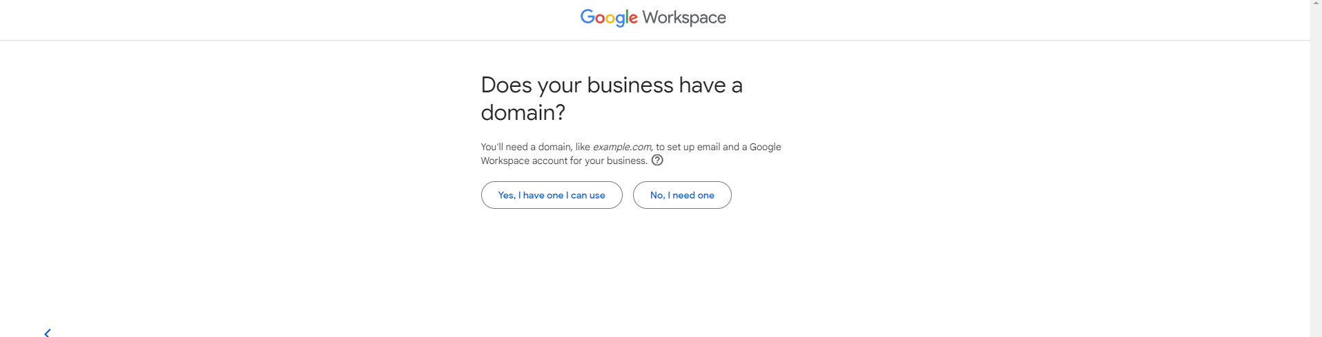 Most of our clients already have domains, so you’ll be able to choose “Yes, I have one I can use”. Alternatively, you can click “No, I need one”—Google will happily sell you a domain.