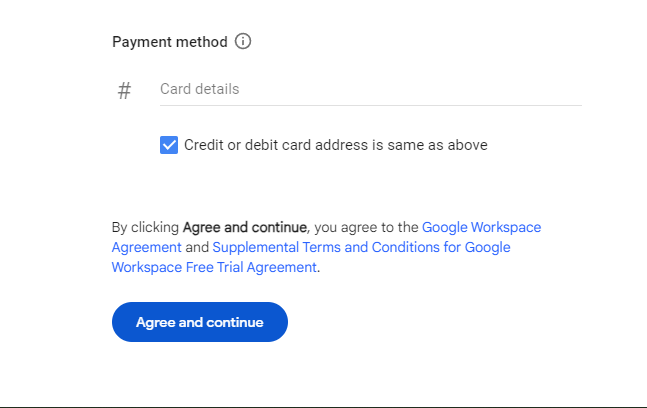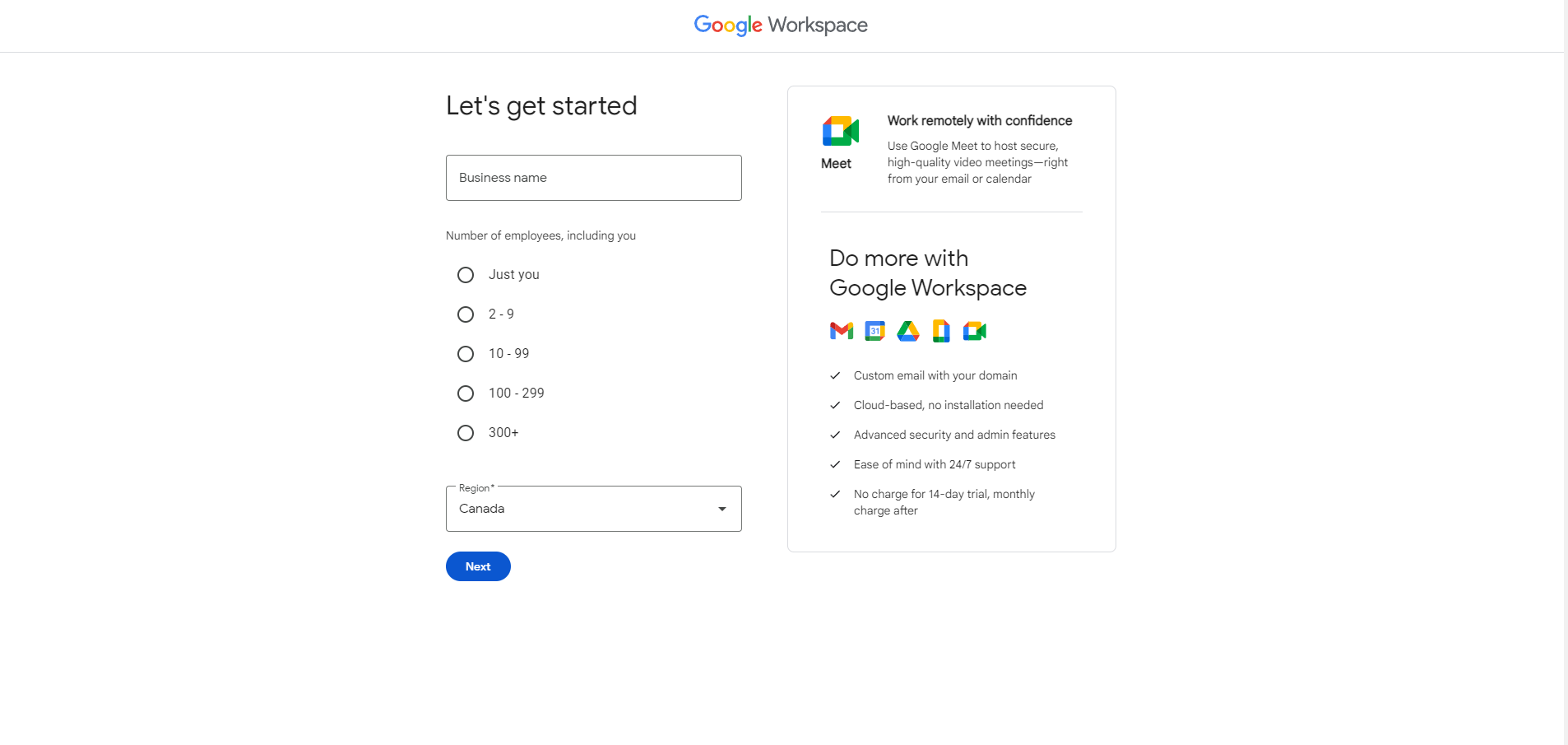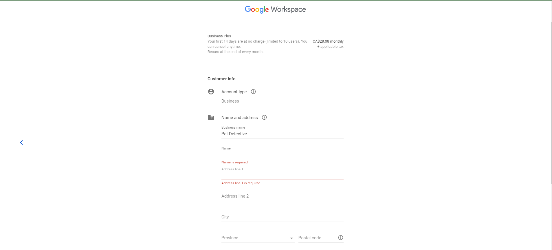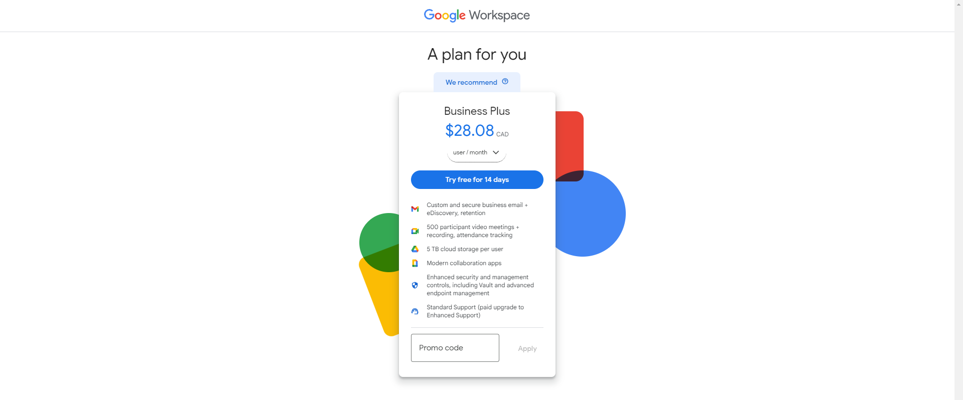 Here, Google recommended its Business Plus plan to us based on the information we provided about the number of users in our Pet Detective business. You may be given a different plan based on the information you provided. Add any promo codes you may have, then press the “Try free for 14 days” button to get started.