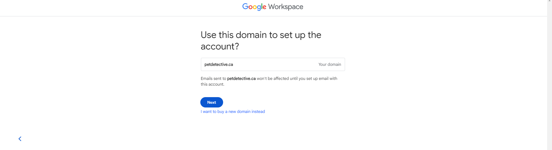 Simply type the domain name of your business (usually the URL for the homepage of your business, like “example.com”) and click “Next”. For our guide, we’ll be using the example domain “petdetective.ca”. Once we hit “Next” we’re met with a confirmation page:
