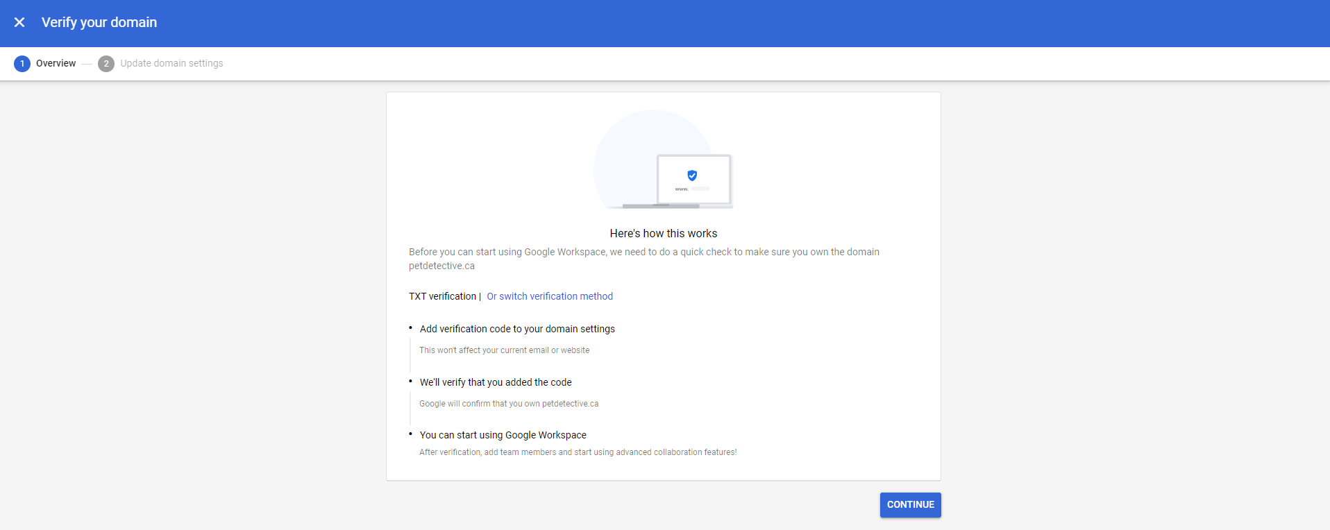 Now, we’ll link our domain to our Google Workspace—simply press the “Verify” button. We’re then brought to a screen with very simple instructions:
