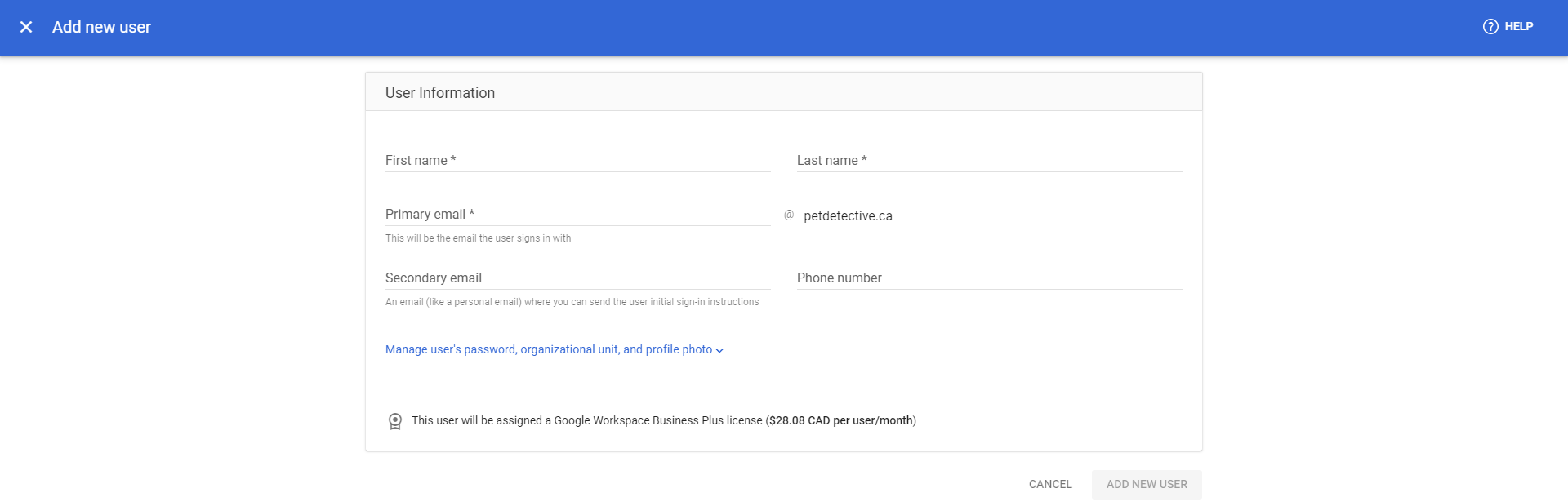 Simply fill out the form, then click “Add New User”. Note that adding a new user to your Google Workspace comes at a cost—you need to pay for a full licence (in our case, $28.08/month).