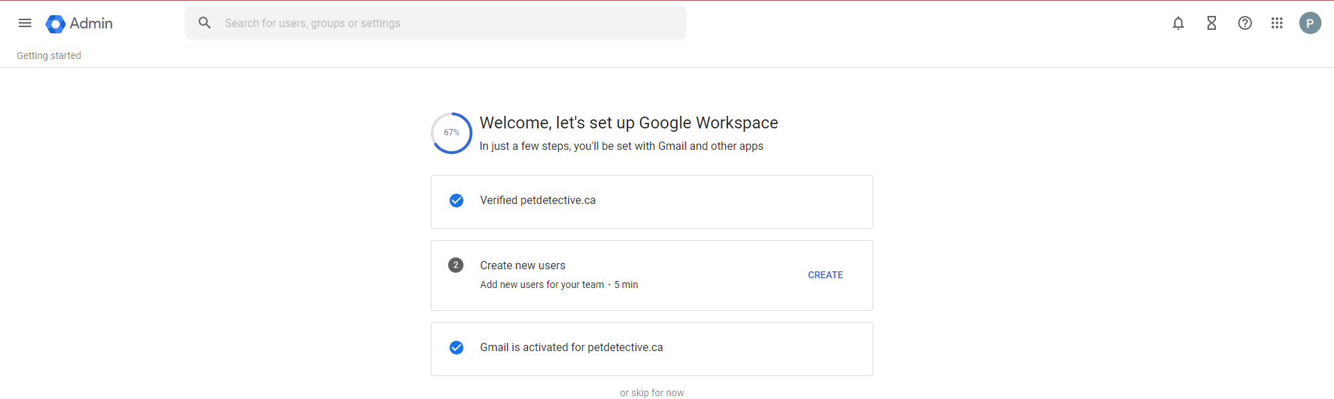 Given that we’re not adding any extra users, we can click “or skip for now” at the bottom. Just like that, we’ve set up our professional Gmail! You’ll be met by the following page: