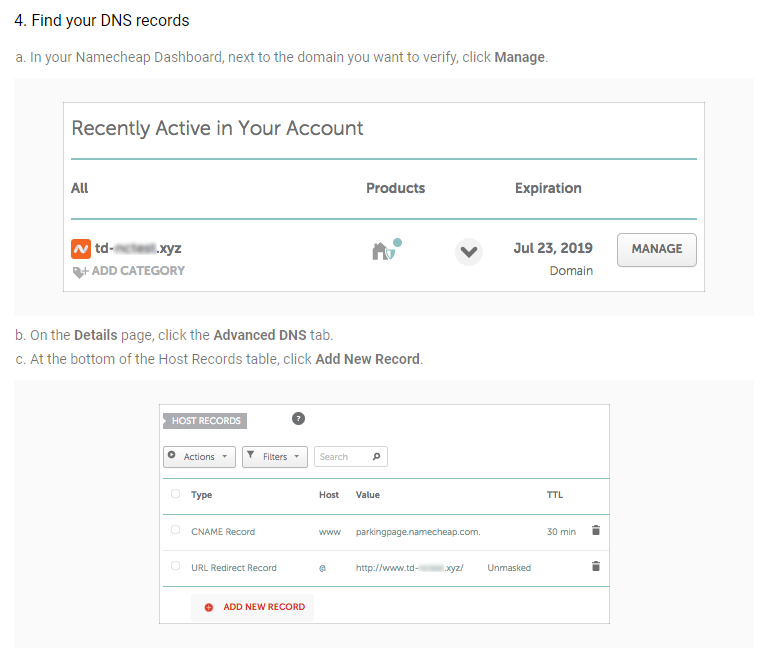 Again, we’ll go to Namecheap and sign in. We’ll then go to “Manage” in our Dashboard. From there, we’ll follow Google’s instructions:
