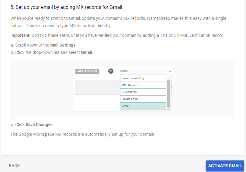 With this step completed, we click “Activate Gmail” back on our Google Admin page: