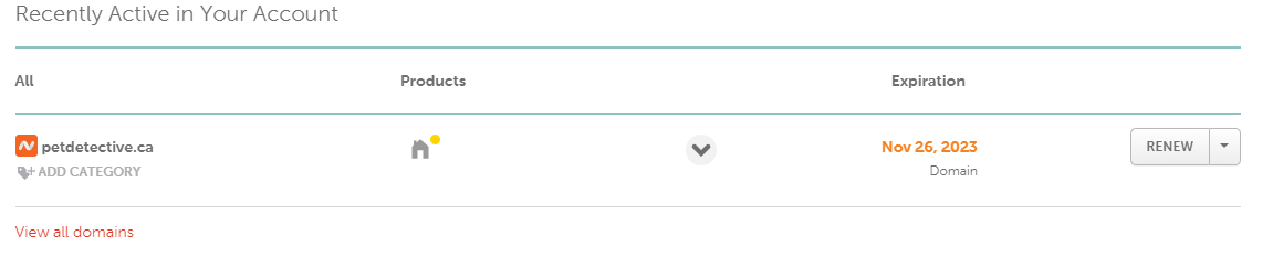 Instead of a “Manage” button, we have a “Renew” button because the domain is coming up for renewal. Pressing the down arrow allows us to find the “Manage” button—if your domain is up for renewal, you may come across a similar button.